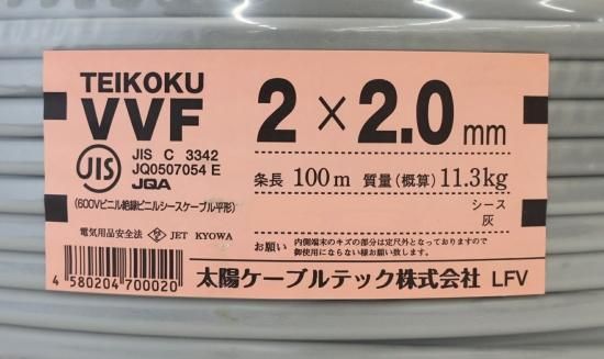 太陽ケーブルテック VVF 電線 ケーブル 2×2.0mm 2.0-2c LFV 条長:100m アウトレット品アウトレット品 ※北海道、沖縄、離島発送不可